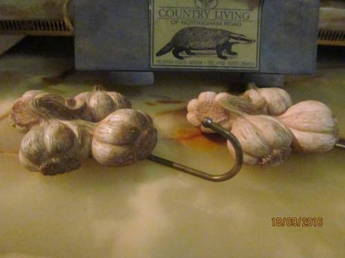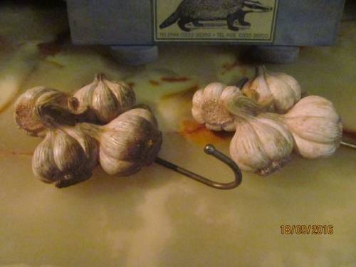 2- Pair of Resin Dish Towel Hooks designed to look Like Garlic. The Hooks are metal and behind each Garlic the Hooks terminate in Circular Holes for Hanging up. BOTH are in PERFECT condition with NO damages anywhere. EACH -- 9cm length of Garlic, 5cm length of Hook (protruding) and 7.5cm width