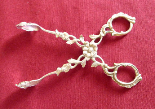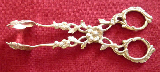 A beautiful and profusely decorated silver scissor action sugar tongs measuring 13cm and weighing 39 grams. The tongs are in good condition and still show traces of the original gilding. Traces of marks inside the bowl, but nothing recognisable. Definitely silver and probably German in origin.