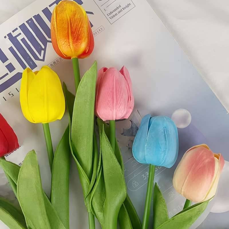 Realistic White and Colorful Tulip Artificial Flowers - Lifelike Touch PU Bouquet for Home, Office and Wedding Decoration | Perfect for Desktop Centerpieces, Photoshoots and Holiday Celebrations