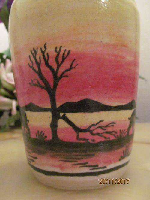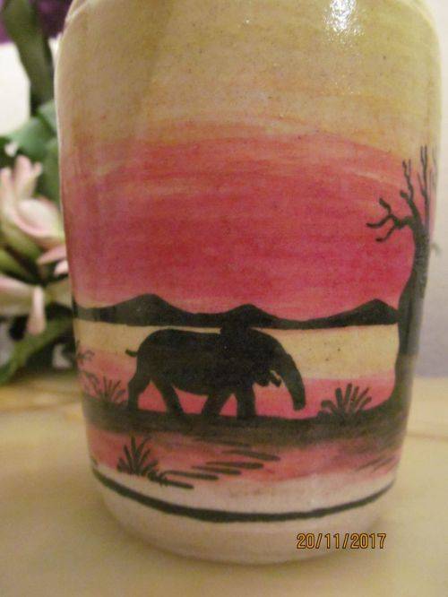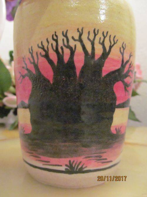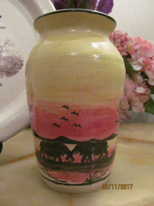 2)- A HAND PAINTED VASE WITH BLACK TRIM ON THE RIM AND A BEAUTIFUL AFRICAN LANDSCAPE DEPICTION IN YELLOW, RED AND BLACK. 14cm HEIGHT.....6.4cm DIAMETER OF BASE.....7.4cm DIAMETER OF RIM