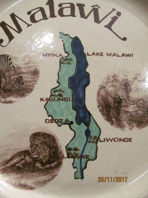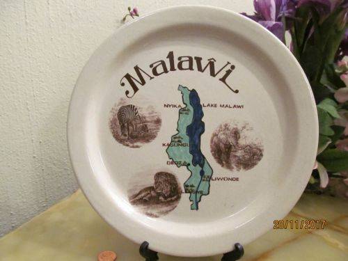 1)- A DINNER PLATE SIZE DECORATIVE WALL PLATE WITH THE WORD - "MALAWI" AS WELL AS A MAP OF THE COUNTRY WITH TITLED TOURIST AREAS AND THREE IMAGES OF WILDLIFE. 2cm HEIGHT.....27.2cm DIAMETER