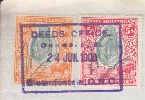 DEED OF TRANSFER ++ 1909 ++ KE VII ++ 10s & 5s MIDDELPLEIN BLOEMFONTEIN ++ SEE SCANS BELOW
