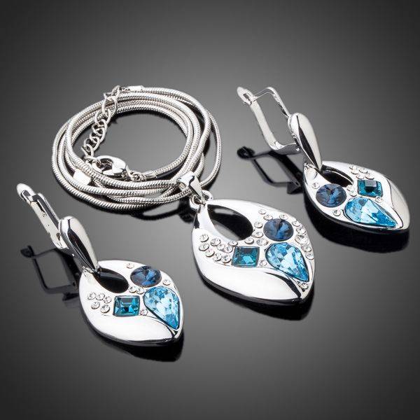 10 Small clear crystals on each earring with 3 large blue crystals.