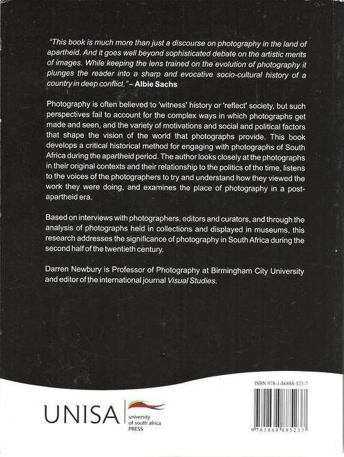 Photography and Apartheid South Africa. Written by Darren Newbury. Foreword by Albie Sacks. Softcover published by UNISA, 2010. Photography is often believed to 'witness' history or 'reflect' society, but such perspectives fail to account for the complex variety of motivations and social/political factors that shape the vision of the world through photography. Defiant Images develops a critical historical method of engaging with photographs of South Africa during the apartheid period. The book looks closely at the photographs in their original contexts and their relationship to the politics of the time, while also listening to the voices of the photographers to try and understand how they viewed the work they were doing, and examining the place of photography in a post-apartheid era. Based on interviews with photographers, editors, and curators, and through the analysis of photographs held in collections and displayed in museums, Defiant Images addresses the significance of photography in South Africa during the second half of the 20th century. 345 pages with index. Tracked postage is R50.00.