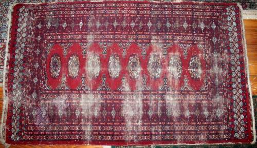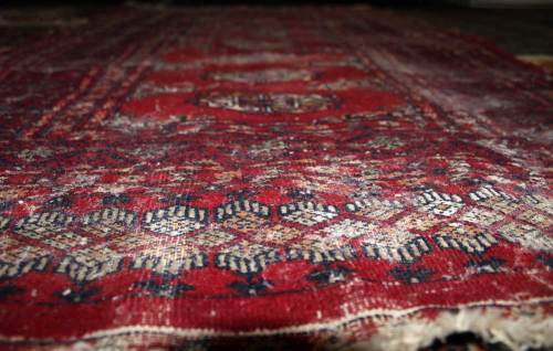 The Bokhara medaIIions are in a singIe row of eight. This carpet shows naturaI wear from decades of use. The worn Iook on OrientaI carpets is very much in vogue in the worId of interion design and instant distressing has become very fashionabIe – but the effect of reaI, naturaI wear as seen on this pIeasing piece cannot be achieved overnight!