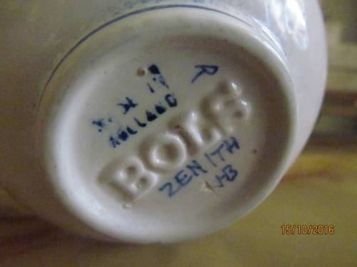 On the Underside is ----- DELFT (which is faded completely but determined through Google), "R", "HOLLAND" , "ZENITH HB" and in Raised Letters as PART of the Porcelain is ---- "BOLS"