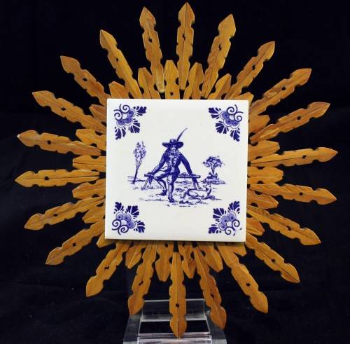 A beautiful tile in the Delft style set in a unique peg design. The tile measures 11cm x 11cm and is in good condition. Make it yours,