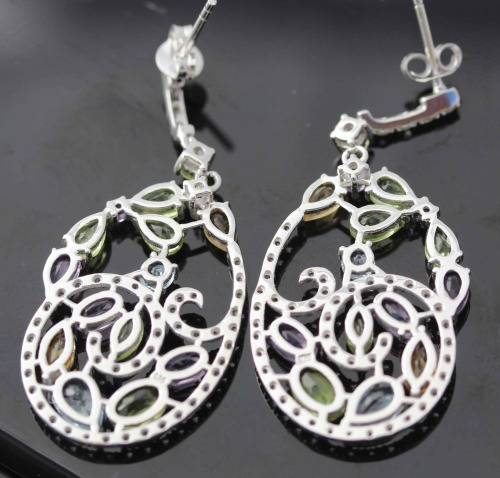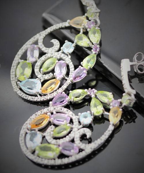 An absolutely gorgeous pair of sterling silver earrings set with amethyst, topaz, citrine and peridot gemstones. The design has a floral theme, together with elegant spirals flowing with the gemstones. They are absolutely feminine and delicate in design but at a whopping 44mm in length you can't miss them! The vibrant gemstone colour combination gives the earrings a refreshing, lively and tropical look. The gemstones have been jeweller tested for authenticity. They are Africa, Brazil and Asia mined, and have an IF - VVS clarity. A beautiful, fun and unusual pair of earrings!
