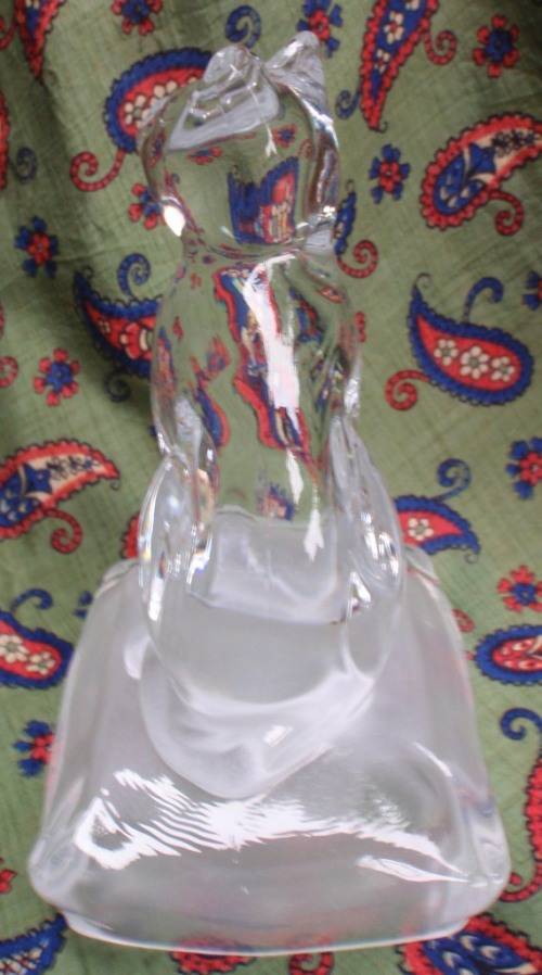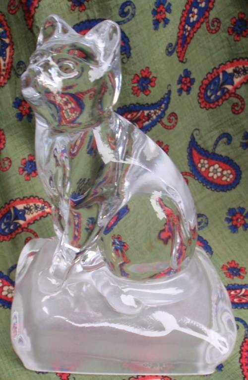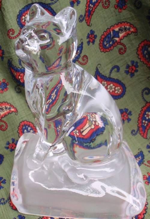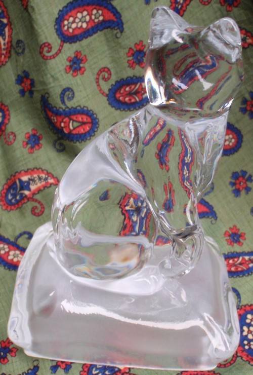 SOLID GLASS 'KITTY' WITH LOVELY SAND BLASTED EFFECT ON UNDERSIDE OF BASE. THIS ITEM IS SOLID AND QUITE HEAVY - WOULD MAKE A LOVELY GIFT OR EVEN A PAPERWEIGHT FOR THE OFFICE - VERY CHARMING! IT IS IN PURRRFECT CONDITION. SIZE: HEIGHT 14CM. BASE MEASURES: 9CM X 7.5CM.