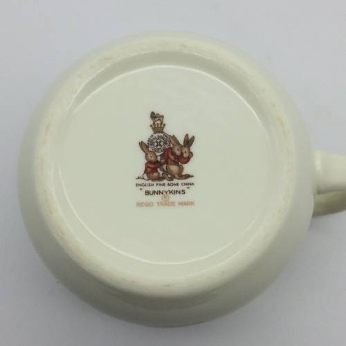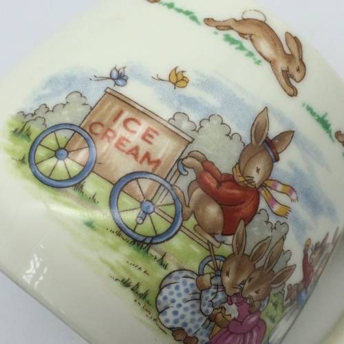 This lovely, single handled Bunnykins, bone china mug, was manufactured by Royal Doulton, as part of their Nursery ware range. It features a bunny handing out ice-creams and is in perfect condition.