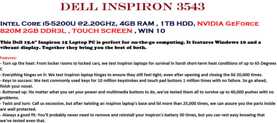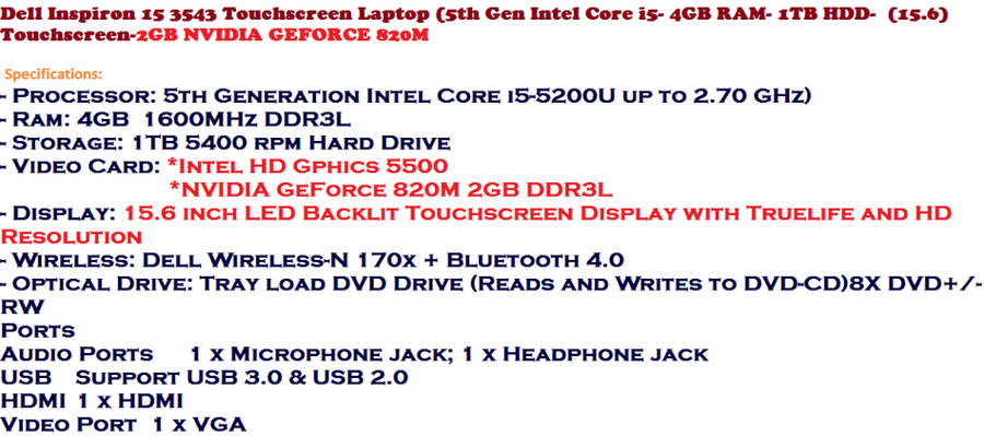 DELL INSPIRON 3543 , TOUCHSCREEN INTEL CORE I5-5200U@2.20GHz,4GB RAM,1TB HDD,2GB NVIDIA GEFORCE 820M DELL INSPIRON 3543 , TOUCHSCREEN INTEL CORE I5-5200U@2.20GHz,4GB RAM,1TB HDD,2GB NVIDIA GEFORCE 820M
