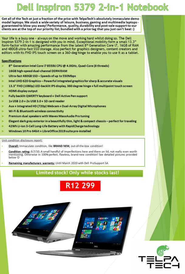 Dell Inspiron 5379 2-in-1 Notebook - **8th gen Core i7, 16GB RAM, 480GB SSD, 13.3" FHD IPS Touch**