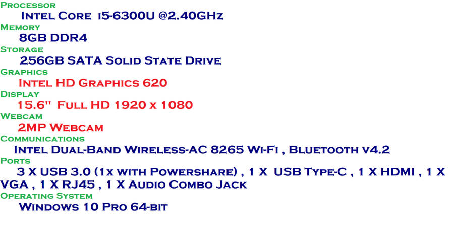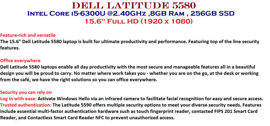 DELL LATITUDE 5580, Core i5-6300U @2.40GHz,8GB Ram,256GB SSD, FHD 1920 X 1080