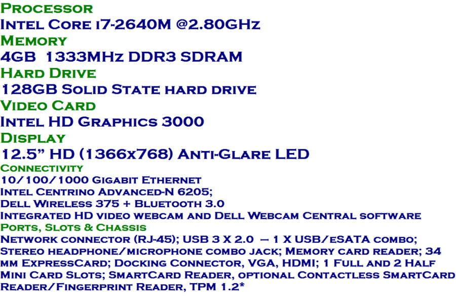 INTEL CORE I7-2640M @2.80GHz,4GB RAM ,128GB HDD , INTEL HD GRAPHICS 3000 AND 3G WWAN