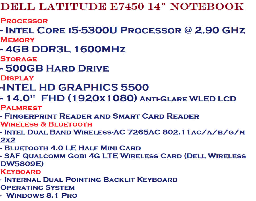 EXCELLENT CONDITION DELL LATITUDE E7450 , CORE I5-5300U @2.90GHz,4GB RAM,500GB HDD.WITH INTEGRATED 3G WWAN