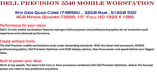 Dell Precision 5540 WORKSTATION ,9th Gen Quad Core i7-9850U, 32GB Ram, 512GB SSD, 4GB Nvidia Quadro Dell Precision 5540 WORKSTATION ,9th Gen Quad Core i7-9850U, 32GB Ram, 512GB SSD, 4GB Nvidia Quadro Dell Precision 5540 WORKSTATION ,9th Gen Quad Core i7-9850U, 32GB Ram, 512GB SSD, 4GB Nvidia Quadro Dell Precision 5540 WORKSTATION ,9th Gen Quad Core i7-9850U, 32GB Ram, 512GB SSD, 4GB Nvidia Quadro