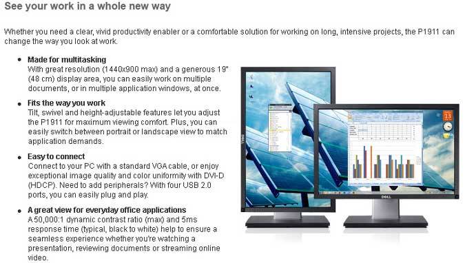 Enhance your workplace productivity with the energy-conscious Dell Professional P1911 19-inch monitor. Featuring a resolution of 1440x900, this Dell LCD monitor has a vivid and vibrant display. This 19-inch monitor has a 1000:1 contrast ratio, displaying the darkest blacks and brightest whites. With a 5 ms response time, this Dell LCD monitor does not produce blurs or ghost images even during fast-action videos. You can enjoy the Dell Professional P1911 monitor from anywhere in the room without distortion, as it can be raised, lowered, tilted, pivoted or swivelled to suit your convenience.