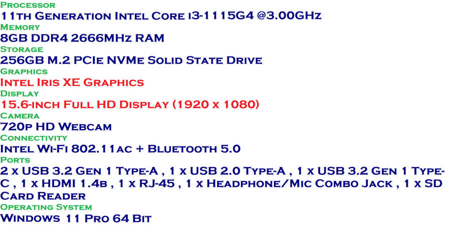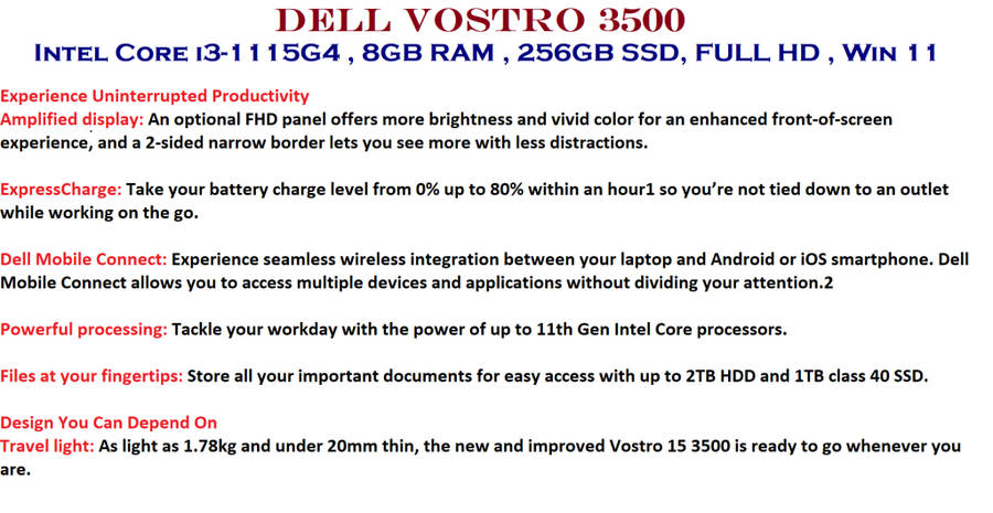 Dell Vostro 3500 Intel Core i3-1115G4 , 8GB RAM ,256GB SSD Win 11 Pro 15.6-inch Full HD 1920 x 1080