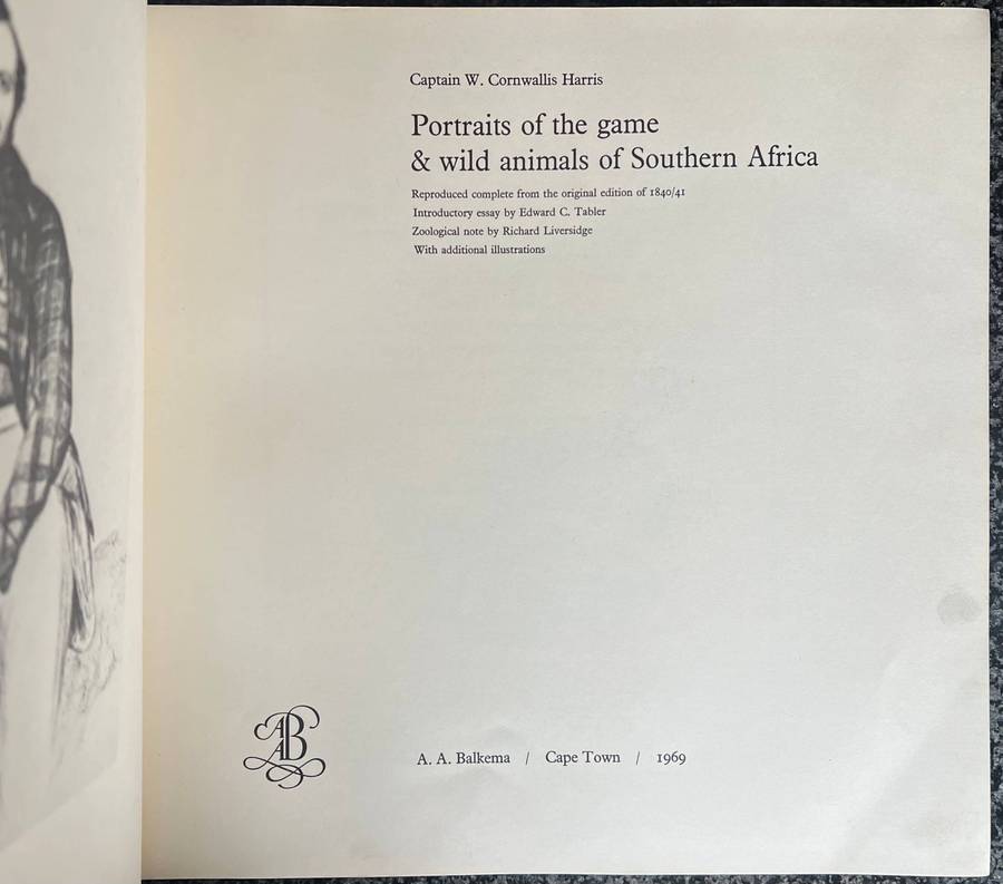 PORTRAITS OF THE GAME & WILD ANIMALS OF SOUTHERN AFRICA BY CAPTAIN W CORNWALLIS HARRIS. PUBLISHED BY A A BALKEMA 1969, DELUXE EDITION, NUMBERED 47/200, HARDCOVER, PREVIOUS OWNER'S NAME ON FEP, 196 PAGES, IN GOOD CONDITION.