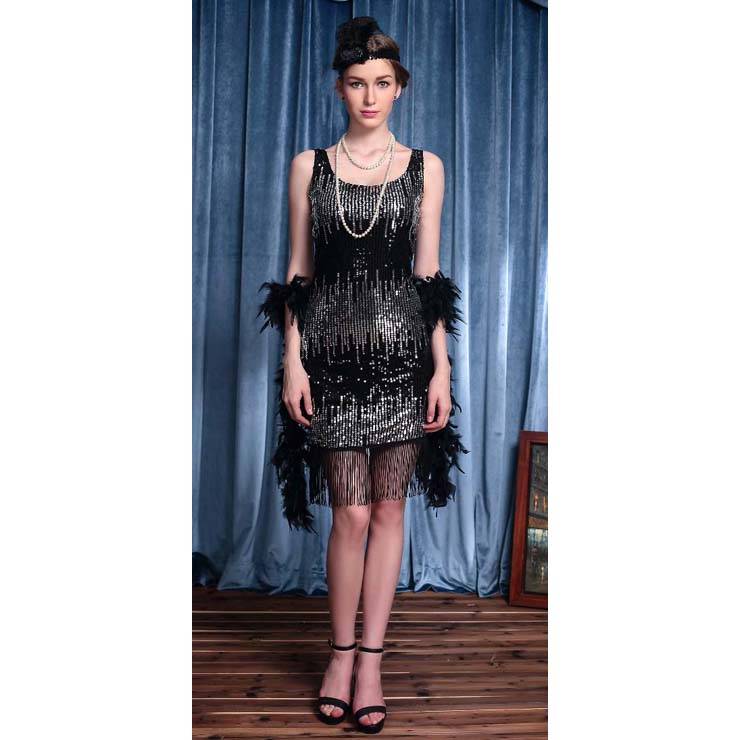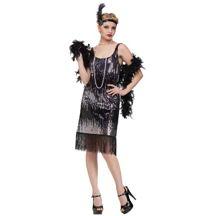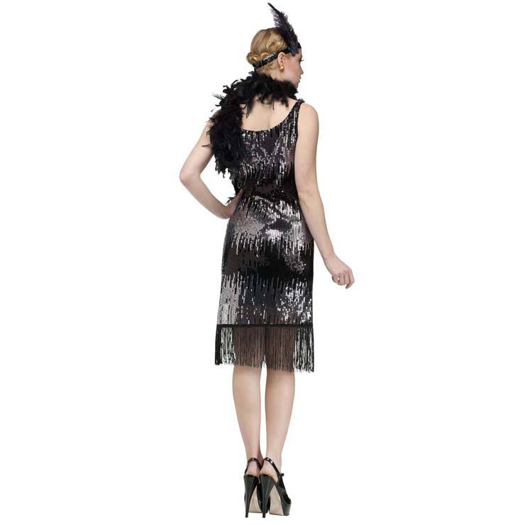 4pcs, Deluxe Flapper Jazz Baby Adult Costume features: a silver and black drip sequin dress with attached slip fringed, and the matching sequin headband, black boa and g-string. (Pearl and shoes not included)