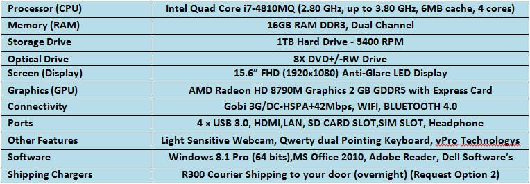 16 GB RAM, 500GB HDD + 500GB Ex HDD, 15.6" FHD (1920 x 1080) Display, AMD Radeon HD 8790M Graphics 2 GB GDDR5 with Express Card