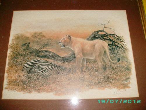 This painting is of a lion over a Zebra kill.