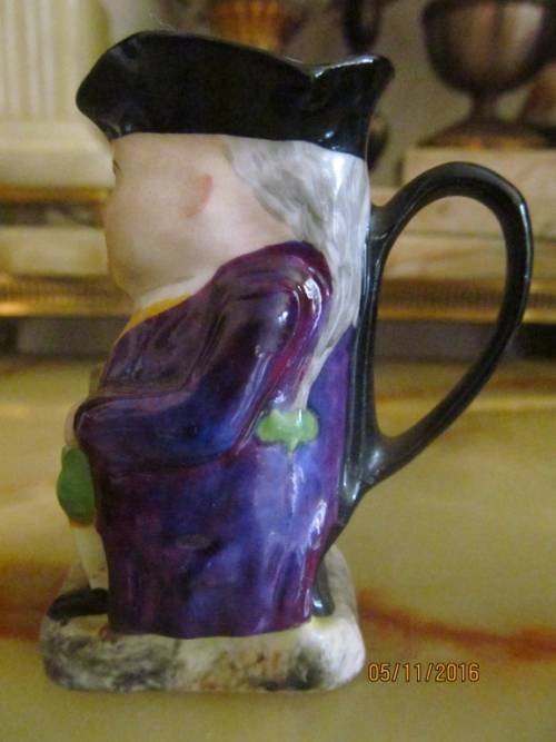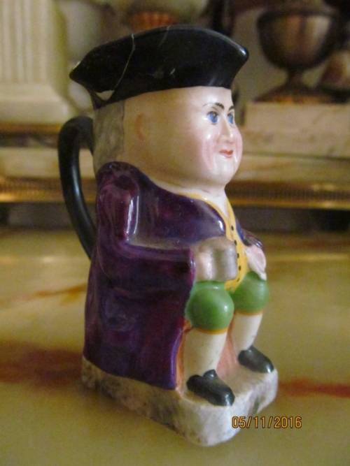 Hand Painted in Bright and Attractive Colors and Glazed into permanence, the Toby Jug is in the Figure of a Seated Gentleman dressed in Period dress.