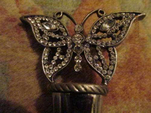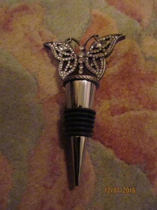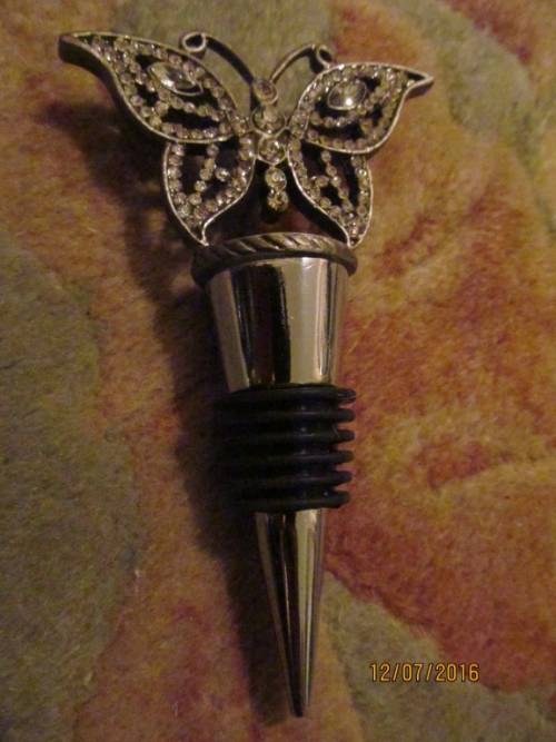 VERY UNIQUE item!! A SOLID silver metal Bottle-Stopper topped by a BEAUTIFUL BUTTERFLY studded on both sides with SPARKLING DIAMANTES. There is black layered rubber collared midway to prevent spillage once the bottle has been sealed !!