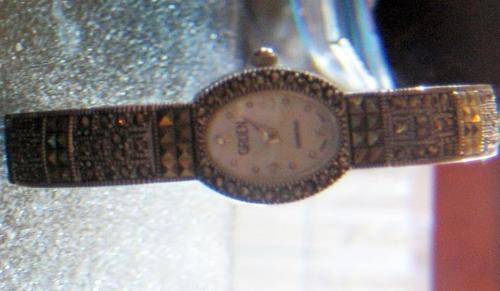 "Gruen Diamond Quartz GR8289". The face is Mother of Pearl surrounded by stones on the bezel and stones on the first 3 cm on each side of the bracelet/bangle. The bangle/bracelet will fit an arm up to 175mm. It cannot be adjusted. Snap clasp. Caseback stainless steel. Inscribed "Gruen GR8289 Stainless Steel Back Base Metal Bezel".