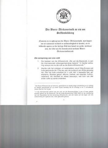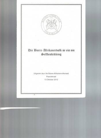 Die Boere-Afrikanervolk se eis om Selfbeskikking, Uitgereik deur die Boere-Afrikanervolk 2012, pamflet-boek, 10 bls, goeie toestand.