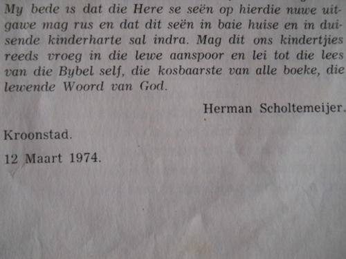 Hardeband, uitgegee 1974, ISBN 0949977136. Die boek is stewig gebind en skoon binne, maar daar is 'n geskenkinskripsie aan die binnekant van die voorblad, daar is ook kleeflintmerke. Vanaf die titelbladsy is die boek skoon binne. Aan die binnekant van die agterblad en die laaste skutbladsy is lelike penmerke. Daar is verhale uit beide die Ou en Nuwe Testament en die boek het 408 bladsye. Posgeld in RSA = R40.00