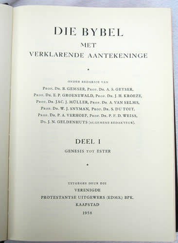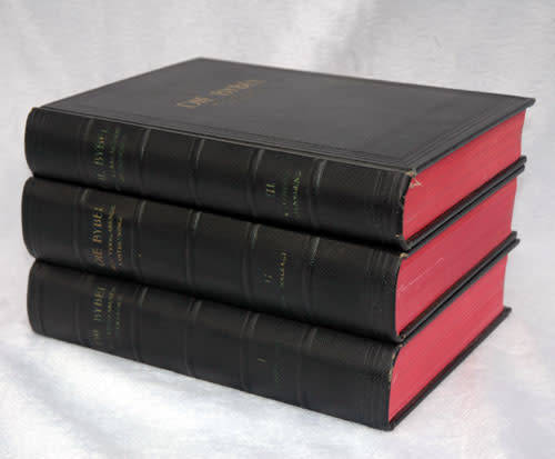 Die Bybel met Verklarende Aantekeninge, Uitgegee deur die Verenigde Protestante Uitgewers Kaapstad 1958, 1959 deel 1-2- en 3. Volledige stel in 'n baie mooi toestand. Mooi Ex-Libris van die voorige eienaar in elke boek aan die binnekant van die buiteblad geplak.