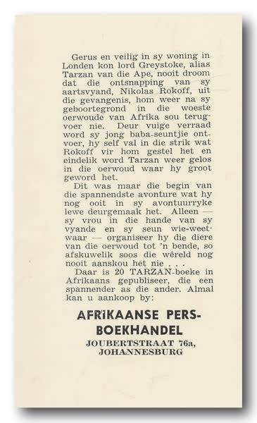 Die Diere Van Tarzan deur Edgar Rice Burroughs (2e druk 1951) vertaal deur AM van Schoor. A5, hardeband, 135 bls. Buiteblad effens verweer. Boek binne in goeie leesbare toestand.