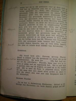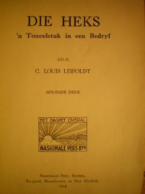 Description: Nasionale Pers, Beperk. 1938, Sewende Druk. Pictorial card cover. Condition: The cover has a water stain all around the edges, the edges are worn, especially the spine and there is a name printed in pen on top of front cover. There are tape marks on the inside of the cover and the back end paper has a set of notes in pen. There are pencil marks throughout and the page corners have been folded.