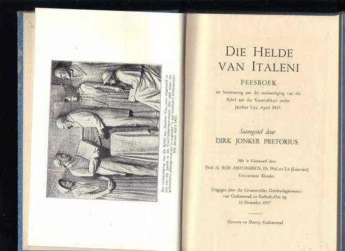 Die Helde van Italeni, Feesboek ter herinnering aan die oorhandiging van die Bybel aan die Voortrekkers onder Jacobus Uys, April 1837, Saamgestel deur Dirk Jonker Pretorius, Uitgegee deur die Gesamentlike Geloftedagkomitee van Grahamstad en Riebeek-Oos op 16 Desember 1957, harde band, eerste uitgawe, verweer op die buiteblad, illustrasies, 47 bls, goeie toestand