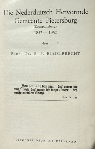 The history of the Dutch church in the Zoutpansberg (Soutpansberg) area, which was where the Voortrekkers first settled when they arrived in the Transvaal.