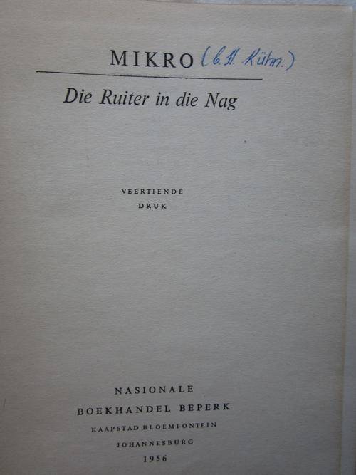 veertiende druk 1956 hardeband - geen stofomslag -135 bladsye, die hardeband is effens verweer,naam voor in die boek, voor en agter in die boek is die blanko bladsy vol geskryf, daar is op n paar plekke in die boek met potlood geskryf, bladsy 94 het geskeur tot ongeveer in die middel van die bladsy, om op te som sal ek die boek as verweerd beksryf, versending R25 in RSA - geen oorsese versending