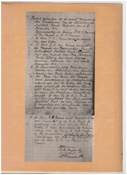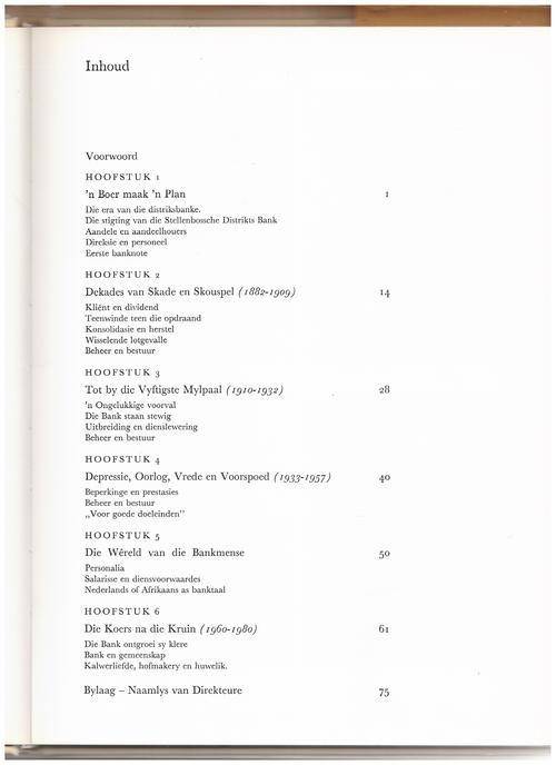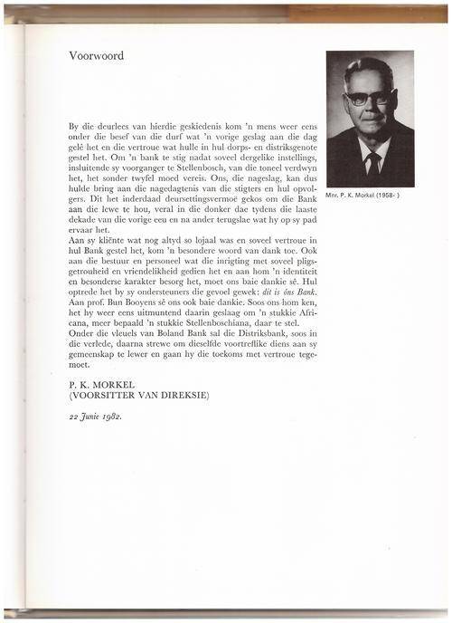 Opeenvolgende fotos van Voorsitters van die Direksie en Bestuurders, fotos van geboue en Stellenbosch vanaf Pappegaaiberg, afskrifte van dokumente, naamlys van Direkteure ens. Voorwoord PK Morkel.