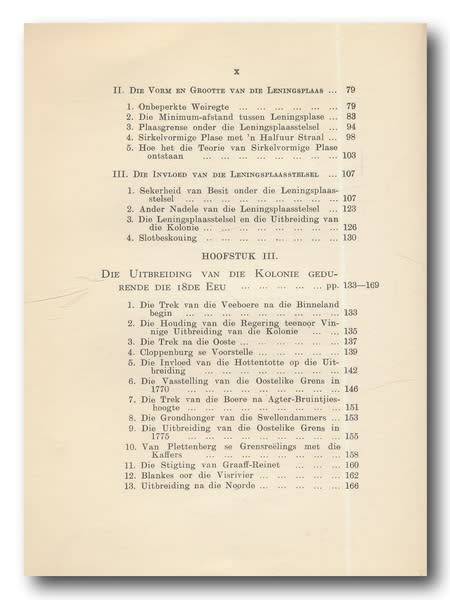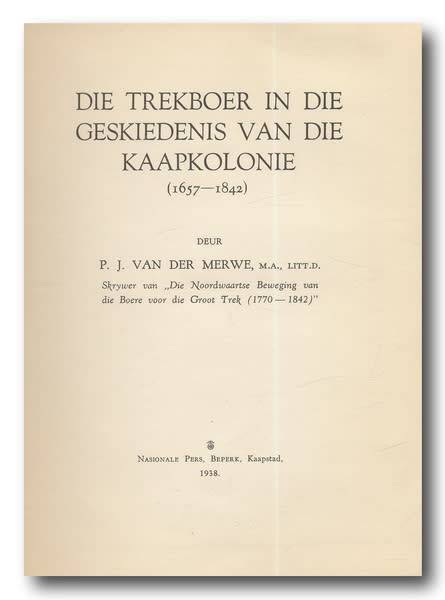 Die Trekboer in die Geskiedenis van die Kaapkolonie, 1657-1842 deur Dr. PJ van der Merwe (Ons Geskiedenis Serie 1938). A5, hardeband, 334 bls. Buiteblad verweer aan regter boonste hoek - verder in goeie stewige toestand. Boek binne in goeie leesbare toestand - 2 bladsye se kante is geskeur(sien onderstaande foto).
