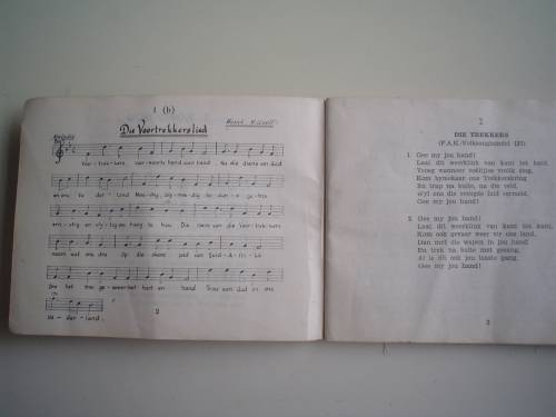 Kleinerige boekie sonder datum, Naam van vorige eienaar voorin. R46 posgeld in SA. Liedjies binne: koers hou, trekkers, handhaaf en bou, trekkerslied, wet, beloftelied, velddienste, buitelewe, psalms, gesange, bosveld, sonskyn, lied van die jeug, kampvuur, aandlied, koffie, stem van SA, ken jy die land? ....