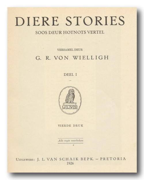 Diere Stories deur GR von Wielligh Deel 1 (1926). Hardeband, 170x210mm, 90 bls. Buiteblad verweer aan voorblad bo en aan rante van boek. rugkant is nog mooi stewig. Bladsye binne in goeie leesbare toestand.