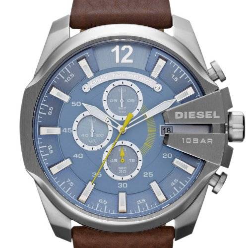 This unique Diesel DZ4281 mens analog quartz chronograph watch features a blue dial; 3 subdials; a stainless steel case; and a brown leather band.