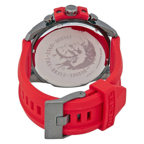 Case size: 59mm; Band size: 26mm; quartz movement with 3-hand analog display, date window, and 3 chronograph subdials; mineral crystal face; imported