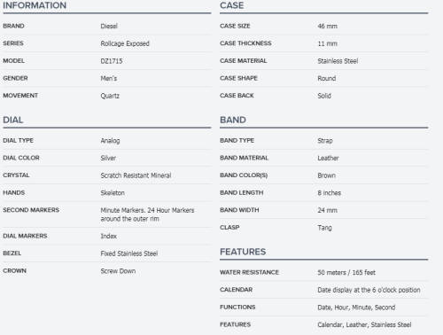 Case thickness: 11 mm. Round case shape. Band width: 24 mm. Band length: 8 inches.Tang clasp. Water resistant at 50 meters. Functions: date, hour, minute, second. Casual watch style. Diesel Rollcage Exposed Silver Dial Brown Leather