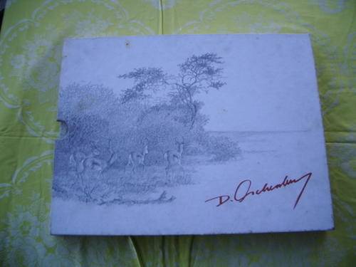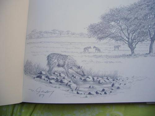 It is still in the original slipcase with its original dust jacket. The binding is oatmeal coloured textured cloth with the title in orange on the upper board. The foreword and captions are in English, Afrikaans and German. 96 pages with full page pencil illustrations of wild life by Dieter Aschenborn. Most of this work was done at Etosha.