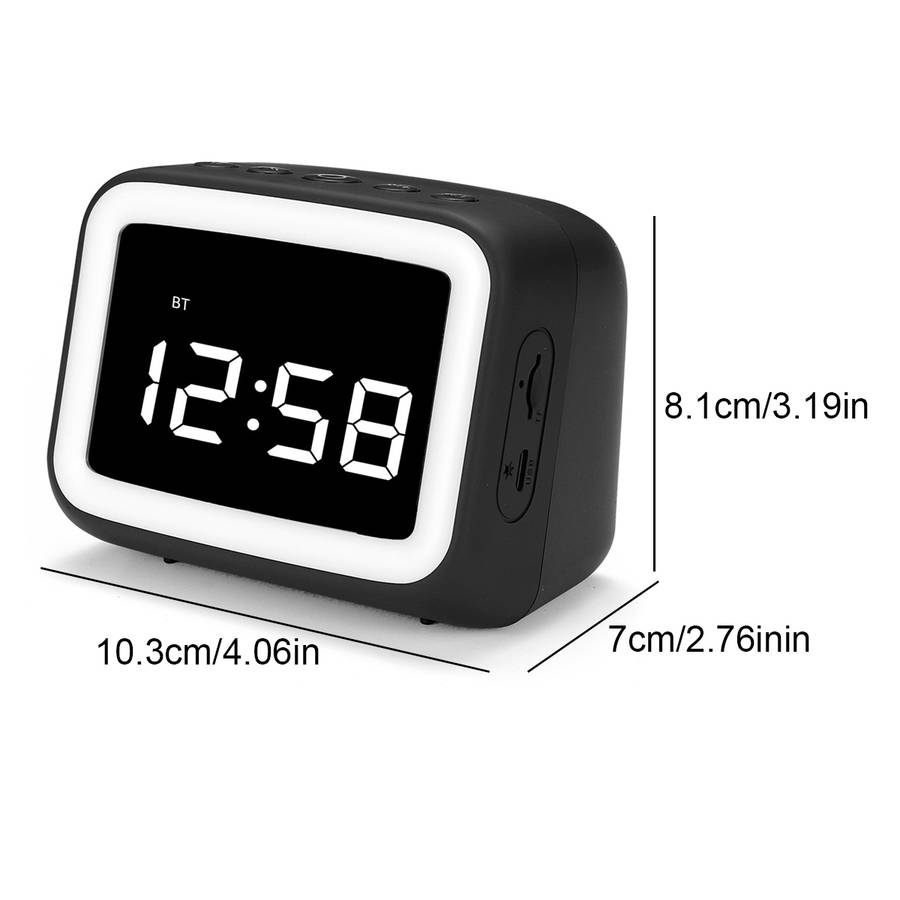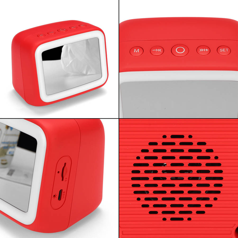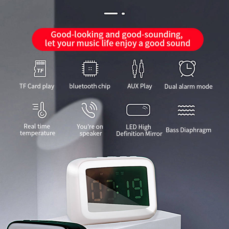 Features: - Multifunctional LED bluetooth speaker, set clock, radio, bedside lamp in one. - You can set 3 different alarm times a day, so you don`t have to worry about setting the alarm cycle frequently. - Built-in lithium battery with a capacity of up to 1200mAh. To use when fully charging, and can be used for up to 6 hours. - LED mirror clock, mirror design, stylish and practical. - Small size, lightweight, and easy to carry.