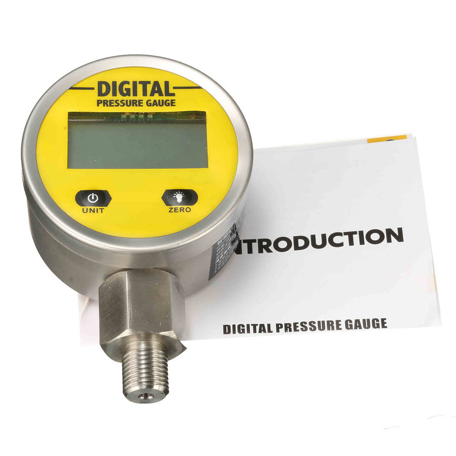 Description: This guage is a economical digital pressure guage. It has a high-precision sensor and display the pressure accurately in real time, such as zero clearing, backlight, on/off button, units, low voltage alarm.And it is convenient to install and easy to operate. It can be used to measure gas, liqulid, oil and non-corrosive mediums of stainless steel. It applies to these fields: pressure container, automation equipment, matching with laboratory equipment.