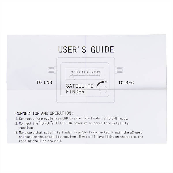 Digital Satellite Signal Finder Meter FTA LNB DIRECTV Signal Pointer SATV Satellite TV Receiver Tool for SatLink Sat Dish The Satellite Finder will align your satellite dish whether you use Dish Network, Direct TV, or any other type of satellite TV. Designed with SMT technology, its superior sensitivity is capable to indicate signal from 0.2dB to 2300MHz. Operated by LNB power. It displays signal strength, according to dish position, with an easy-to-read analog needle, allowing you to make necessary adjustments without having to yell back and forth from the window. Features : In-line IF signal strength meter. Excellent sensitivity. DC pass to LNB and internal light. Built-in 0Hz, 22KHz, 13V, 18V indicating LEDs and buzzer. Elegant exterior and convenient to carry. Specification :