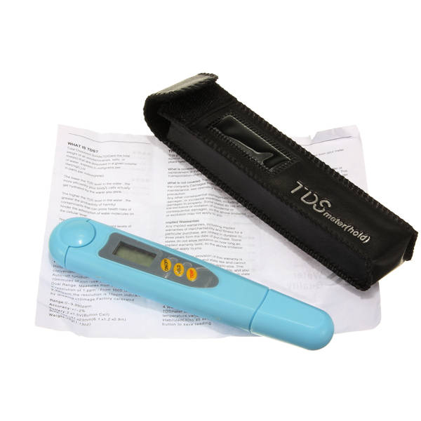 Features : Can be used in water purifiers and filters, food (vegetable, fruits) & drink quality monitoring, pools and spas, aquariums, hydroponics and so on. Hold function : Saves measurements for convenient reading and recording Auto-off function : Turns off meter after 10 minutes of non-use to conserve batteries Dual Range : Measures form 0-999ppm, with a resolution of 1ppm. From 1,000 to 9,990ppm, the resolution is 10ppm, indicated by drinking x 10image, factory calibrated. Specifications : Rang : 0-9990ppm Accuracy : +/-2% Color : Blue Weight : 54g Item size : 150mm x 28mm x 15mm Battery : 1 x CR2032 3V lithium battery (included) Note : Do not drop the entire TDS meter in water of dip beyond the maximum immersion level. This unit is not water-tight and is not covered under the warranty if water enters the unit. Package Includes : 1 x TDS Water Quality Meter Tester Pen 1 x A Professional Special Bag 1 x CR2032 3V Lithium Battery 1 x English User Manual Details Pictures :