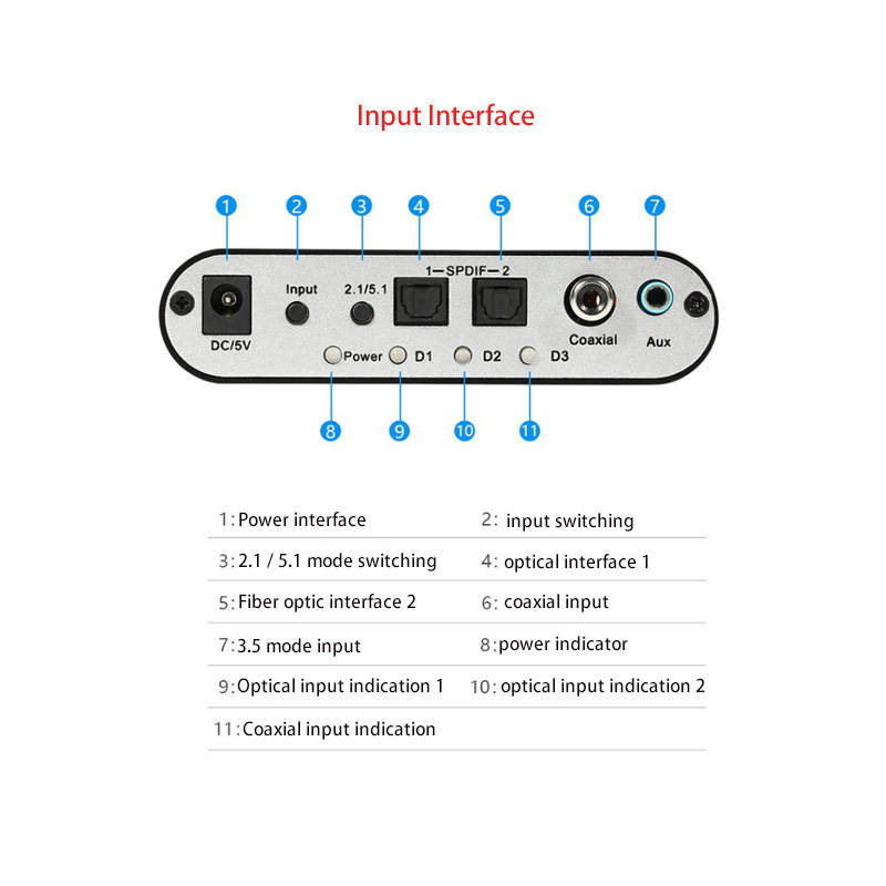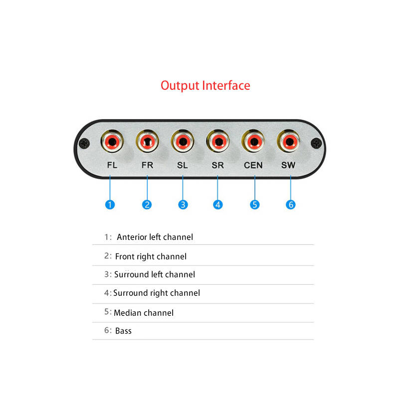 | Product | Digital to Analog 5.1 channel Stereo AC3 Audio Converter Optical SPDIF Coaxial AUX 3.5mm to 6 RCA Sound Decoder Amplifier |